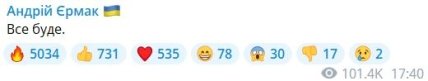 Оновлено: пізніше Єрмак відредагував своє повідомлення, написавши: "Питання далекобійної зброї та винищувачів для України схоже може бути вирішене".