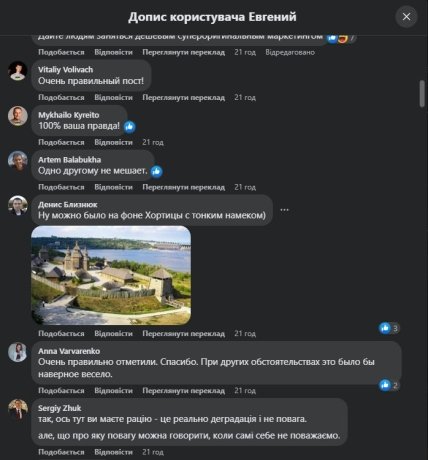 Під дописом зібралося близько сотні коментарів. А сам допис отримав десятки поширень і 2,5 тисячі лайків. Але в самих коментарях думки розділилися. Частина людей вважає, що така реакція доречна, адже гумор допомагає боротися із суворою реальністю. Інші схиляються до того, що є речі, які не варто перетворювати на гумор.
