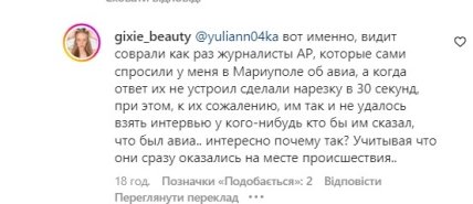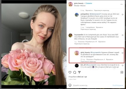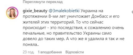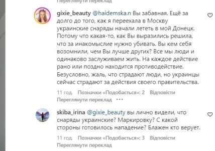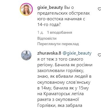 "Я от теж з того самого регіону. Бачила як росіяни захоплювали Горлівку, знаю, як вбивали людей в окупованому слов‘янську в 14-му, бачила як у 15-му на Краматорськ летіла ракета з окупованої Горлівки, яка забрала життя людей у мирному місті. Хто ж тебе конкретно так образив в Україні, що ти обрала брехливу риторику?" – пише жінка.