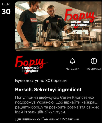 Із 30 березня всі користувачі стримінгу Netflix зможуть насолодитися документальним фільмом про український борщ. Кухар Євген Клопотенко, який став центральною фігурою стрічки, розповість глядачам про те, як фірмову національну страву нашої держави готують в різних регіонах.