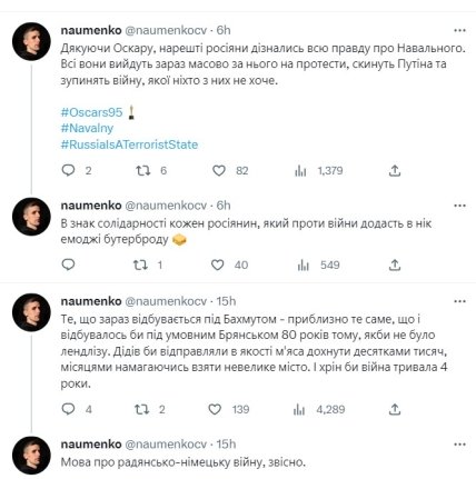 До прикладу, порівняли українську сім’ю, яка постраждала від путіна, та російську сім’ю, яка постраждала від путіна. На фото ліворуч – діти з відірваними внаслідок вибуху кінцівками, які стали героями фільму "Будинок зі скалок", що змагався з фільмом "Навальний". На фото праворуч – сім’я Навального гарно одягнена та зі щасливим виглядом. Допис опублікував у Twitter волонтер Олександр Науменко.