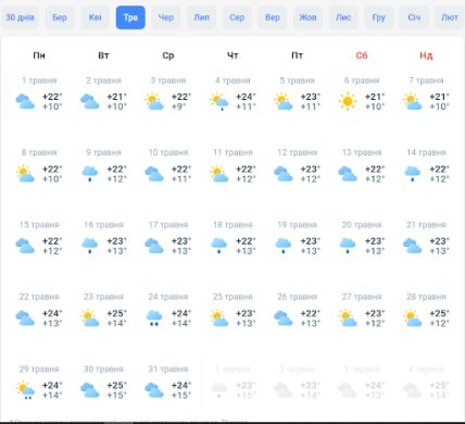Останні 10 днів травня хмарність і сонячна погода будуть змінювати одна одну. Повітря прогріється до +22…25 °С вдень, а вночі показники термометрів зафіксуються біля позначок +13…15.