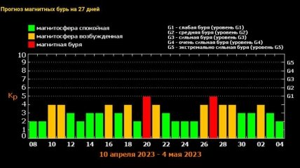 Найбільш інтенсивні магнітні шторми прогнозуються 20 та 27 квітня. А повторення бурь 4-го рівня слід очікувати 18, 21, 26, 28 та 29 квітня.