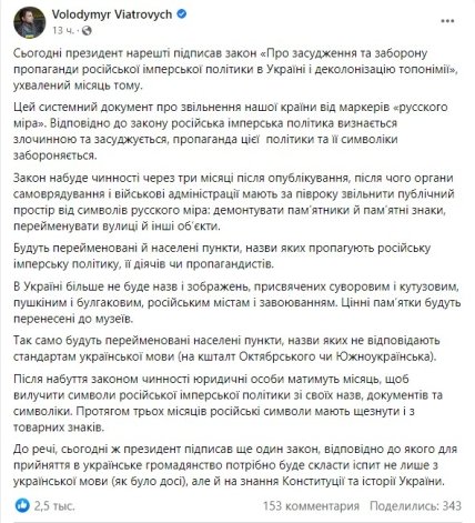 Цінні визначні пам'ятки будуть перенесені до музеїв. Також буде перейменовано населені пункти, назви яких не відповідають стандартам української мови", — написав він у Facebook.
