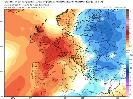 Нижче наведена карта демонструє прогноз середньої аномалії (відхилення від норми) температури повітря в Європі за період з 5 по 12 травня 2023 року. Як бачимо, зазначає Кібальчич, вся східна частина регіону опиниться у владі холоду.