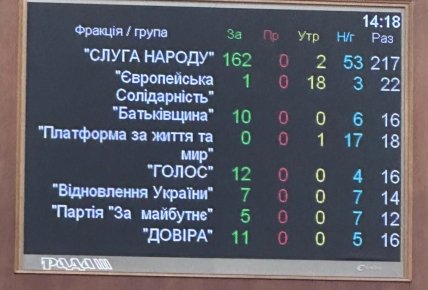 Від фракції "Відновлення України", "Партія "За майбутнє" та "Довіра" проголосували лише 7, 5 та 11 нардепів відповідно, а 7, 7 та 5 народних обранців не голосували зовсім. Примітно, що від фракції "ОПЗЖ" немає жодного голосу "за".
