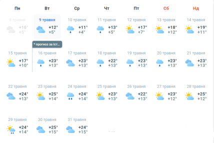 У третій декаді травня похмура і дощова погода будуть постійно мінятись місцями з сонячними, але кількість хмарних днів буде перевищувати ясних. Температура повітря вдень становитиме +25 градусів. Вночі показники термометрів покажуть 14 теплих градусів.