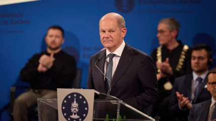 Окрім цього, Шольц завершив українською свій виступ з нагоди вручення Міжнародної премії імені Карла Великого президенту України. Захід відбувся у місті Аахен.