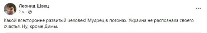 "Яка всебічно розвинена людина! Мудрець у погонах. Україна не розпізнала свого щастя. Ну, крім Діми", — пишуть у мережі, натякаючи на його програш на президентських виборах 2019 року та підтримку від журналіста Дмитра Гордона.