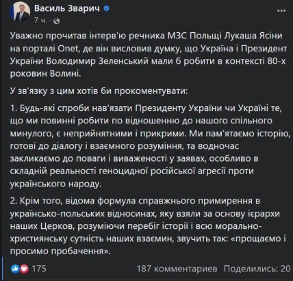 Своєю чергою посол України в Польщі Василь Зварич назвав спроби нав’язати українському президенту чи державі будь-які слова про спільне минуле є "неприйнятними та сумними".