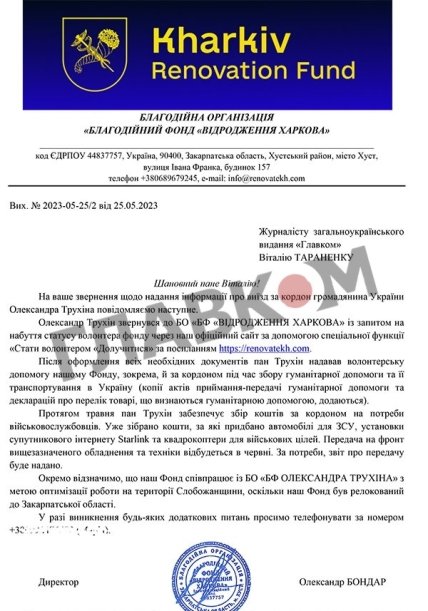 "Офіційно у водії Трухіна відрядив благодійний фонд "Відродження Харкова". Організація з’явилася у березні 2022 року. Засновниками виступили п’ятеро мешканців Харкова. Із березня 2023-го фонд прописаний у Хусті Закарпатської області", — йдеться у матеріалі.