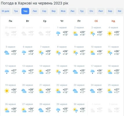 У Харкові перший день літа буде дощовим та похмурим, проте наступні дні будуть сонячними та спекотними. Вночі температура повітря коливатиметься від +13 до +18 градусів, а вдень стовпчики ртутних термометрів піднімуться до +23+28 градусів.
