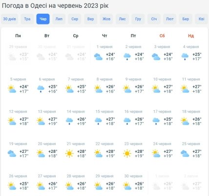 На півдні країни літо розпочнеться похмурою погодою з опадами, проте через чотири дні погода покращиться. Вночі температура повітря в Одесі коливатиметься від +16 до +19 градусів, а вдень від +23 до +28.