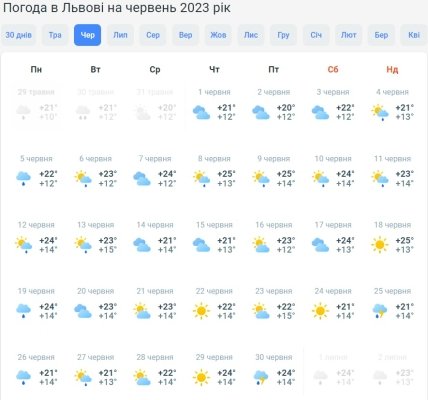 Опади у Львові очікуються кілька разів на тиждень, іноді навіть із грозами. Так, згідно з прогнозом погоди, парасольки мешканцям та гостям Львова знадобляться 4–6, 8–13, 19, 25–27 та 30 червня.