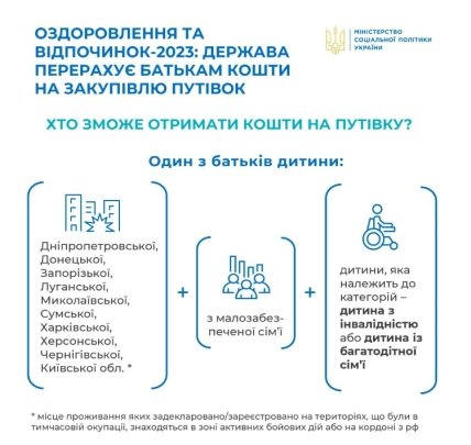 Претендувати на отримання путівки до табору зможуть лише діти віком від 7 до 18 років, які зареєстровані в одному в населених пунктах однієї з десяти областей, які перебували в окупації, що перебувають у зоні активних бойових дій або на кордоні з рф. При цьому дитина має бути з малозабезпеченої чи багатодітної сім’ї, або мати інвалідність.