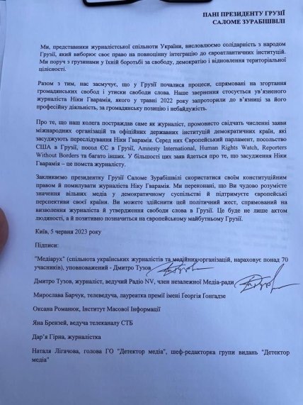 Уповноважений Медіаруху журналіст Дмитро Тузов передав до посольства Грузії в Україні колективне звернення до президентки Грузії Саломе Зурабішвілі із закликом звільнити з в’язниці Ніку Гварамія.