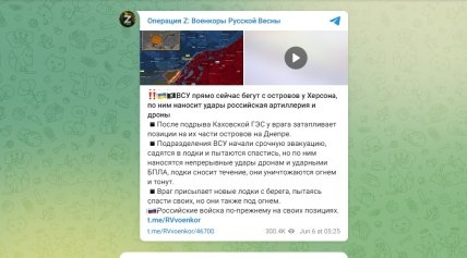 Інші російські телеграми канали раділи з того, що через підрив кахівської дамби позиції ЗСУ на островах підтоплює. ЗСУ намагаються евакуюватися і рятуватися, далі вони публікують радісні відео, як вони завдають ураження по позиціям наших воїнів на островах.