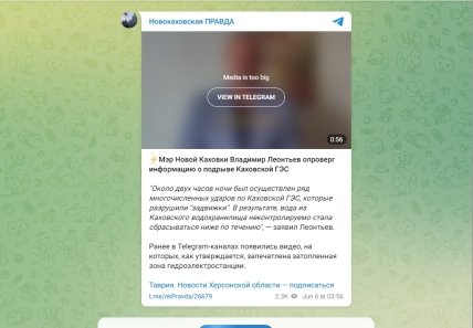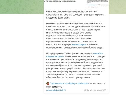 Нижче скріншот з Telegram-пабліка, який раніше стверджував, що дамба "саморуйнувалася".