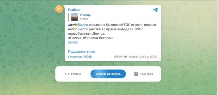 Далі російська OSINT розвідувальна спільнота Рибар підхоплює цю тезу і говорить про "підрив невеликої ділянки дамби".