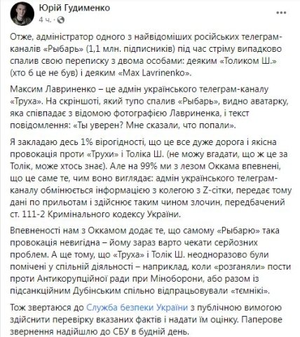 Крім того, за Лавриненка також заступився народний депутат Олексій Гончаренко, який повідомив, що той не так підписаний у телеграмі і в його профілі фото не стоїть.
