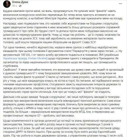 Свій пост Олена Дума написала в пізню годину і кинулася звинувачувати журналістів та активістів, які нагадали скандали, в яких помічено нового главу АРМА, у "продажності". Усі факти, що вони привели проти неї, Дума назвала "домислами". Зокрема, йшлося про ганебне звільнення з посади виконавчої дирекції ФССУ, а також судові справи проти неї.