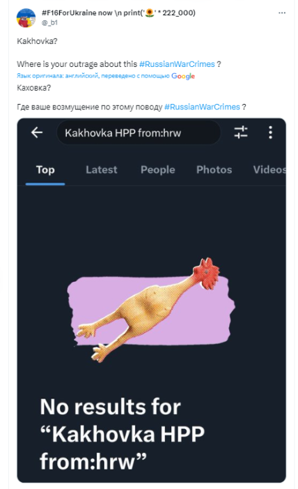 У коментарях також звернули увагу на той факт, що Human Rights Watch ніяк не відреагувала на підрив Каховської ГЕС російськими окупантами, що спричинило величезну трагедію, а наслідки після нього розтягнуться на десятки років.
