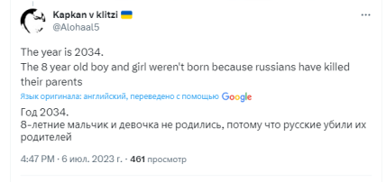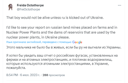 Відповідний пост було опубліковано на сторінці організації, яка займається захистом прав людей, у Twitter. У ньому HRW описують страшну долю дітей у майбутньому, які зіштовхнуться із наслідками війни. Йдеться про гіпотетичного хлопчика та дівчинку восьми років, які випадково натраплять на касетні боєприпаси.