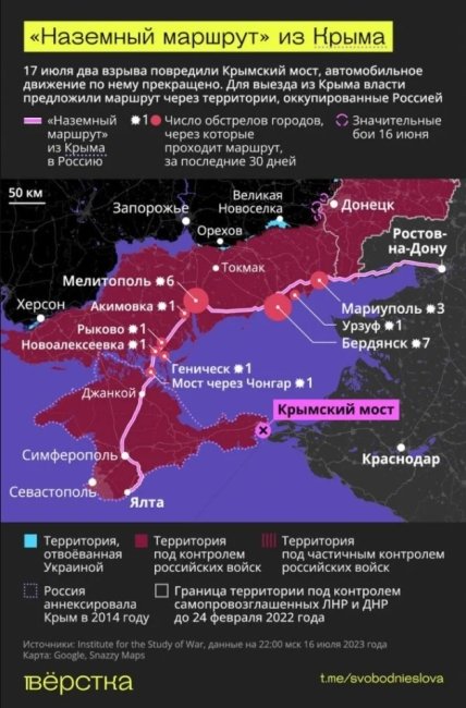 "Ударів ЗСУ, найчастіше, зазнавали "тимчасова столиця" окупованої частини Запорізької області Мелітополь (шість разів), розташований на березі Азовського моря порт Бердянськ (не менше семи разів), а також Маріуполь (тричі). Крім того, обстрілів зазнавали населені пункті, що перебувають або прямо на маршруті, або в безпосередній близькості від нього - Генічеськ, Рикове, Новоолексіївка, Якимівка та Урзуф.", — пишуть журналісти.