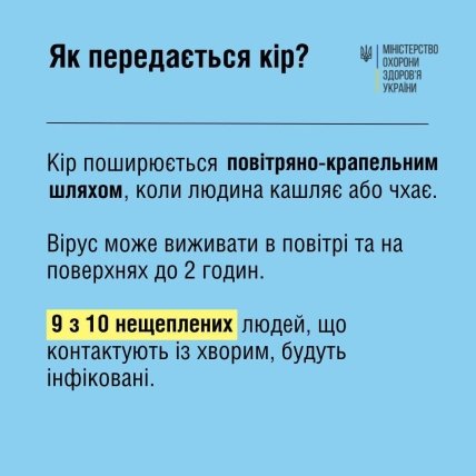 Чому це особливо важливо під час війни? Тому що кір — надзвичайно заразна хвороба. Уявіть: у бомбосховищі купа людей, серед них — і вакциновані, і ні. І багато нещеплених. Це — гарантований спалах, а то й епідемія.