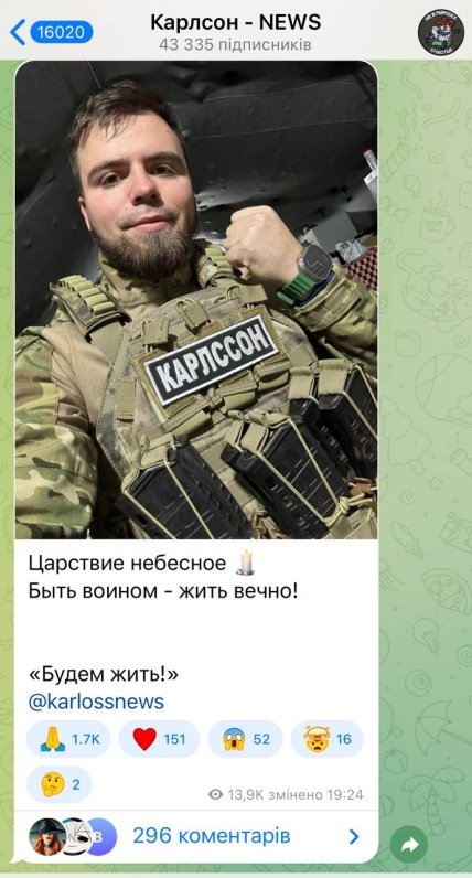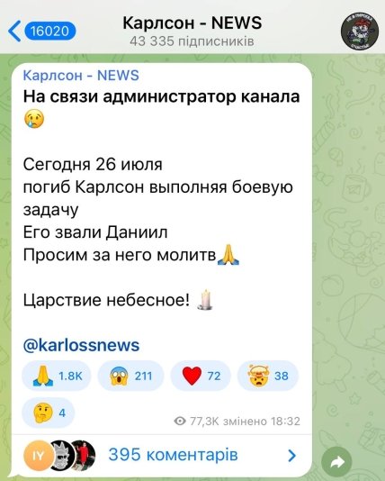 Так український блогер Денис Казанський повідомив, що під час бойових дій було ліквідовано окупанта на ім’я Данило, який вів телеграм-канал Карлсон-News.