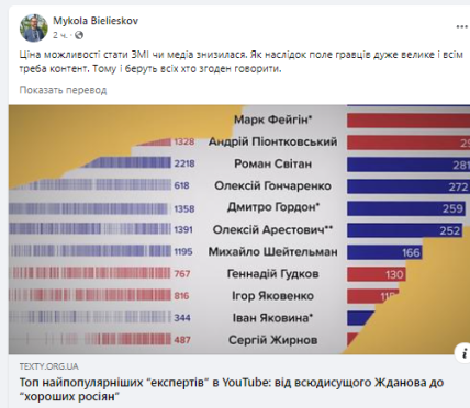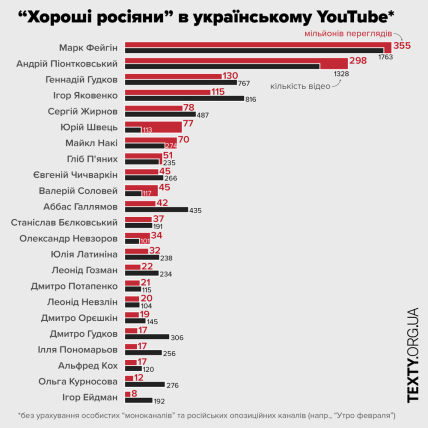 "Зі 108 фігурантів, які набрали понад 100 згадок за досліджуваний період, 23 – це так звані хороші росіяни, яких активно запрошують на ефіри українські канали та ведучі. Вони зайняли приблизно пропорційну частку ефіру – близько 3300 годин з 12 600, які прийшли на нашу. Проте переглядів було відчутно більше – майже 1,5 млрд із 4,4 млрд з усього масиву (35%) 80% трафіку в українському YouTube-ефірі їм забезпечили п’ять каналів: канал Гордона, "Фабрика новин", Politeka, а також "24 канал" та "Прямий", — пише Texty.