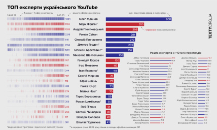 Так, з 24 лютого, дня, коли почалася повномасштабна війна в Україні та по 1 червня поточного року на 40 досліджуваних каналах як гостей/експертних спікерів було запрошено близько 5 тисяч осіб. З ними згенеровано 58 000 "експертних відео" — це приблизно 18 тисяч годин контенту. Переглянули його загалом 5,2 млрд разів.