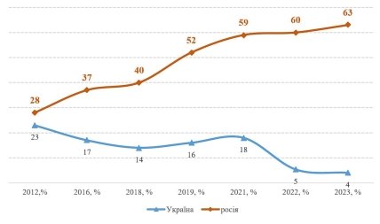 2012 року приблизно однакова частка населення ставилася до Сталіна позитивно. Далі в Україні ставало дедалі менше тих, хто добре ставиться до диктатора, а в росії, навпаки, лише почало зростати. Нині у країні-агресорі більшість населення відповідає, що ставиться до Сталіна позитивно. Тобто з 2012 по 2023 рік показники збільшилися з 28% до 63%.