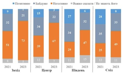 В усіх регіонах України абсолютна меншість прихильно ставиться до Сталіна (від 1% на Заході до 8% на Сході). Порівняно з 2021 роком, ці дані значно змінилися і можна помітити, що громадяни стали більш негативно налаштовані стосовно радянського диктатора. За деякий час до повномасштабного вторгнення Півдні та Сході кількість тих, хто мав позитивне та негативне ставлення до Сталіна, була практично однаковою. Цього року домінує негативне ставлення.