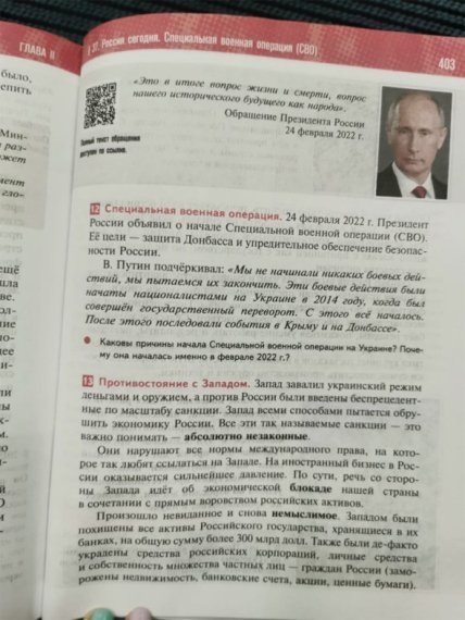 Окремо у підручнику школярів попереджають, що до інформації про бойові дії в інтернеті варто ставитися насторожено, оскільки "світова індустрія з виробництва постановочних роликів, вкидів, фейкових фото та відео працює безперервним конвеєром". Також його сторінки всіяні цитатами путіна, наприклад, з його звернення з нагоди вторгнення в Україну 24 лютого.