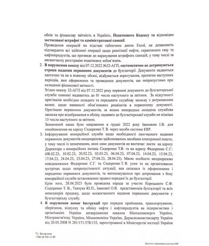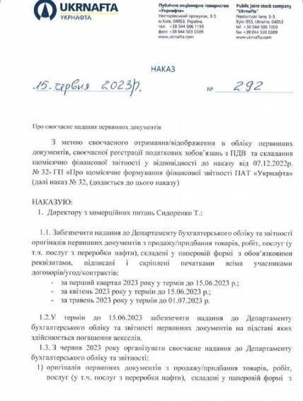Втім, як стало відомо "Апострофу", таке твердження зовсім не відповідає дійсності. Так, згідно службової записки головного фінансового директора ПАТ Юрія Ткачука, вбачається, що бухгалтерія не мала майже половини первинних документів з реалізації продукції (нафтопродуктів і скрапленого газу) у першому кварталі 2023-го на 5,6 млрд грн станом на червень місяць.