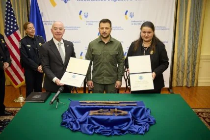 Про це повідомляє Офіс президента. У присутності Зеленського Міністр внутрішньої безпеки США Алехандро Майоркас та посол України в США Оксана Маркарова підписали відповідний сертифікат передачі українських артефактів, конфіскованих правоохоронцями США.