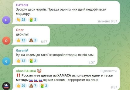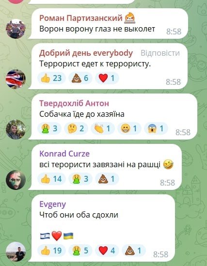 Тим часом користувачі мережі взялися активно коментувати новину: "росія та її друзі з ХАМАСА використовують одні й ті ж методи, одним словом – тероризм на обличчя", "Терорист їде до терориста", "Хто б сумнівався, до господаря на уклін і заразом звітувати за виконаний терор" і т.д.