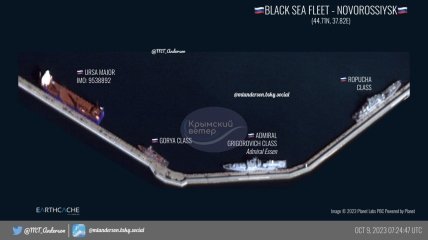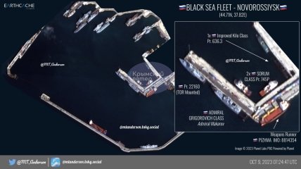 Росіяни продовжують передислокувати свої кораблі Чорноморського флоту з тимчасово окупованого Севастополя та Феодосії в окупованому Криму до порту Новоросійська. Про це свідчать супутникові знімки за 9 жовтня, що їх опублікував OSINT-дослідник MT Anderson.