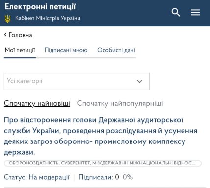 "Цю мою петицію досі блокують та відмовляються реєструвати. Як бачите, все ще висить "на модерації". Поки голова Держаудитслужби продовжує свою диверсійну діяльність по знищенню обороноздатності України