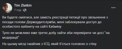 Волонтеру Тіму Златкіну, який намагався реєструвати петицію про звільнення голови Держаудитслужби, заблокували доступ до особистого кабінету на сайті Кабінету Міністрів.