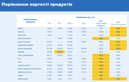 Зазначається, що узагальнені результати аудиту засвідчили, що у результаті непродуктивно використано бюджетних коштів у сумі 7 439,1 млн грн. Придбання найбільш вживаних продуктів харчування здійснювалося за цінами, які в середньому на 30% вище ринкових. Визначена Міноборони вартість харчування військовослужбовця ЗСУ на добу перевищує вартість такого харчування в інших підрозділів сектору безпеки та оборони від 3,17 млрд грн (Нацгвардія) до 7,04 млрд грн (СБУ).
