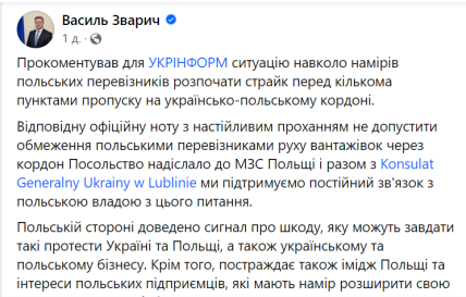 У статті йдеться про те, що як тільки польські перевізники відчувають конкуренцію, вони відразу організують страйки, мітинги та акції. Наразі збитки від можливого блокування пунктів пропуску з Польщею оцінити складно. Бо актуальна статистика не публікується. Але, за словами, старшого наукового співробітника Інституту економічних досліджень та політичного консалтингу Ірини Коссе, на Україну чекатиме уповільнення експорту, проблеми з постачанням техніки та обладнання, збитки для бізнесу.