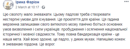 Пізніше Фаріон підкинула хмизу у вогонь заявою, що воювати за Україну – це не заслуга, а обов'язок, а також назвала російськомовних захисників "москворотими". Наразі сторінка Фаріон у Facebook заблокована.