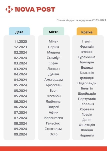 У грудні 2023 року "Нова пошта" планує почати працювати в столиці Франції Парижі. Першим у 2024 році має відкритися відділення у Мадриді, Іспанія, воно заплановане на лютий. Цього ж місяця НП планує розпочати роботу в Туреччині, у Стамбулі. Також у планах на 2024 рік – Велика Британія, Швейцарія, Португалія і не тільки.