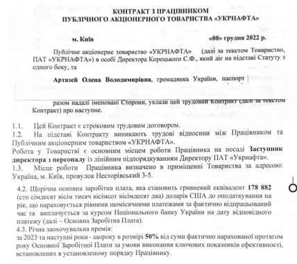 Як повідомляють в Укрнафті, Корецький уклав контракт з Оленою Артазей, яка по суті займає посаду "головного кадровика" ПАТ та призначив їй заробітну плату у розмірі більше $22 000 на місяць (щомісячна заробітна плата та премія). Це за ринковим курсом НБУ становить близько 800 000 грн/місяць. Примітно, що згідно зі статтею 21 Кодексу законів України про працю і нормами Закону України "Про акціонерні товариства", призначення Артазей є вельми сумнівним. На це звернув увагу експерт Михайло Шнайдер.