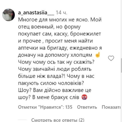 При цьому користувачів мережі ситуація не влаштувала. Люди продовжили висловлюватися проти виділення фінансування шоу: "Всі кошти мають йти на ЗСУ!!!! Знімайте свої тихі вечори за донати або за власні кошти!!!! Гидота. Це все вже слухати!!!!! Виправдання хапуг, не нажеруться ніяк!!!!"; "Якби ваші діти,чоловіки,батьки,брати сиділи в окопі без тепла,омуніції, тепловізора, без авто і без зброї я тоді хотіла б вас почути. Кожен пристосувався в теплі і добрі і розказує про інформаційну війну. Ще про важливість доріг і бруківки розкажіть"