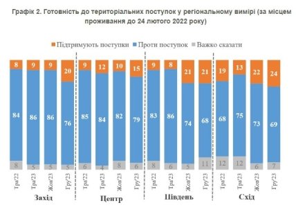 Соціологи зазначили, що з травня поточного року частки тих, хто готовий до територіальних поступок, поступово збільшується. Так, показники зросли з 10% у травні до 14% у жовтні та до 19% у грудні.