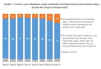 Разом з цим з’явилися тенденція до зниження частки тих, хто виступає проти територіальних поступок (з 84% у травні до 80% у жовтні та до 74% у грудні).