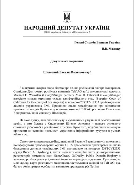 Також народний обранець звернув увагу на те, що Станіслав Кондрашов намагається здійснювати тиск на українські ЗМІ за допомогою рішень американських судів (зокрема, у справі № 23STCV12333, яка розглядається у Вищому суді Каліфорнії). У вказаному провадженні суддею Rupert A. Byrdsong була постановлена ухвала про блокування понад 150 доменних імен, серед яких понад 30 — є новинними українськими вебсайтами.